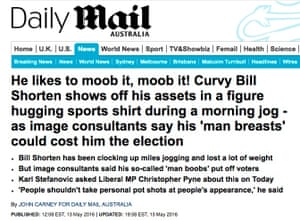 The Daily Mail showing itself to be an equal-opportunity body shamer whacked this headline over pictures of Bill Shorten’s body recently: “He likes to moob it, moob it! Curvy Bill Shorten shows off his assets in a figure hugging sports shirt during a morning jog – as image consultants say his ‘man breasts’ could cost him the election”.