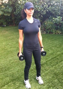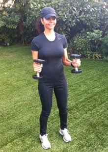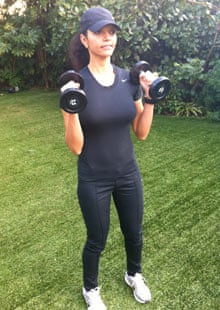Keeping elbows tucked into your sides raise hands/weights, slowly and smoothly to shoulders. Lower and repeat 10 times.