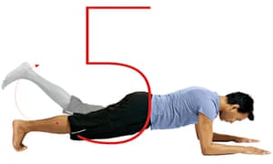 Lie on your front, with hands under your shoulders. Lift up so that you’re resting on your forearms. Ensure your body is in a straight line and your bottom is not sticking up. Slowly raise one leg, keeping your core tight to make sure your body doesn’t rotate. Lower the leg and repeat on other side. Aim for 10-15 raises on each side.