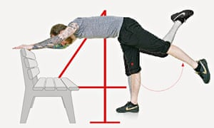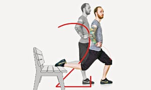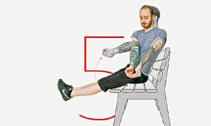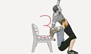 Stand a couple of steps away from the bench, feet hip-width apart. Lean forward and place your hands on the seat of the bench, shoulder-width apart, arms straight. Slowly lower yourself towards the bench so your face is almost touching it, then slowly return to the start position. Keep your core muscles engaged. Tom suggests doing the same move with your hands on the seat of the bench to make it harderTo increase core-strengthening, lower into the press-up, then lift one hand off the bench. Rotate your body away from the supporting arm as you straighten it and point your hand into the sky. Then repeat on the other side. Aim for 15-20 press-ups.